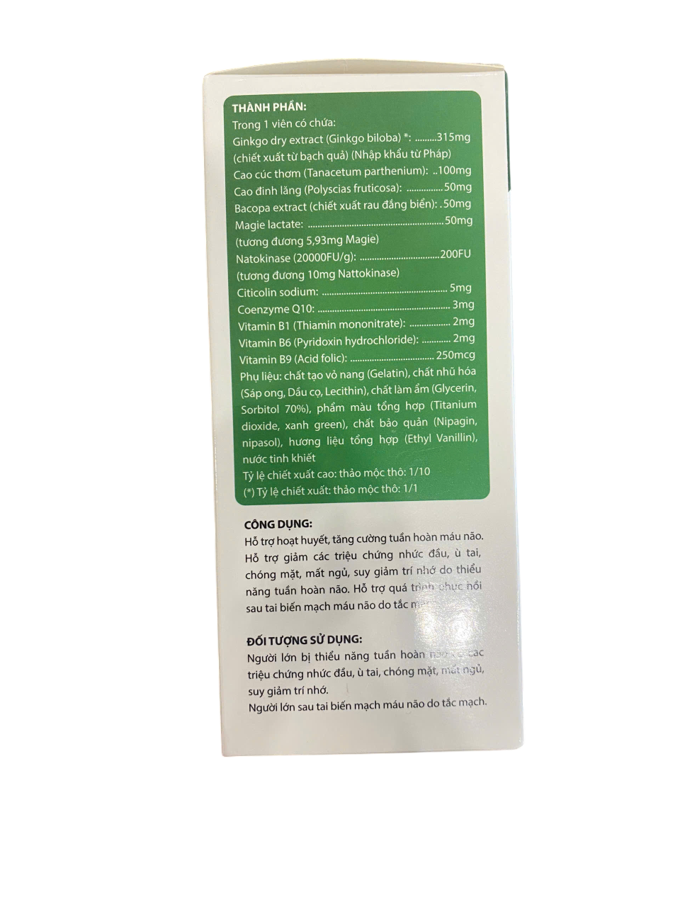 - Hỗ trợ giảm các triệu chứng nhức đầu, ù tai, chóng mặt, mất ngủ, suy giảm trí nhớ do thiểu năng tuần hoàn não.