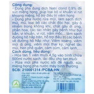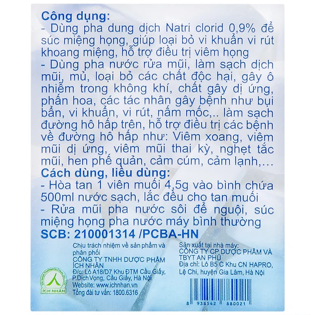 Muối y tế Ích Nhân 50 viên 4.5g là muối Natri 0,9% (nước muối sinh lý) dạng viên rất tiện lợi, dùng pha dung dịch rửa mũi, súc họng, làm sạch dịch mũi, mủ…