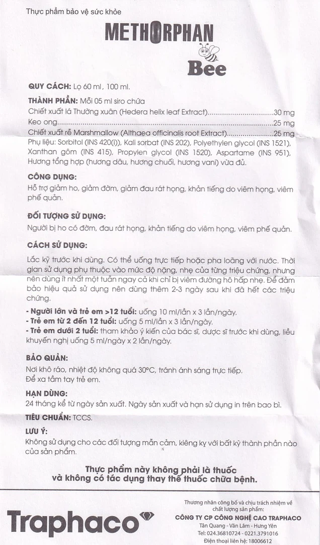 Siro Methorphan Bee với thành phần từ chiết xuất rễ Marshmallow, dịch chiết lá thường xuân và keo ong sẽ hỗ trợ giảm ho và giảm đờm hiệu quả. Sản phẩm gần như không gây tác dụng phụ, an toàn để sử dụng lâu dài.