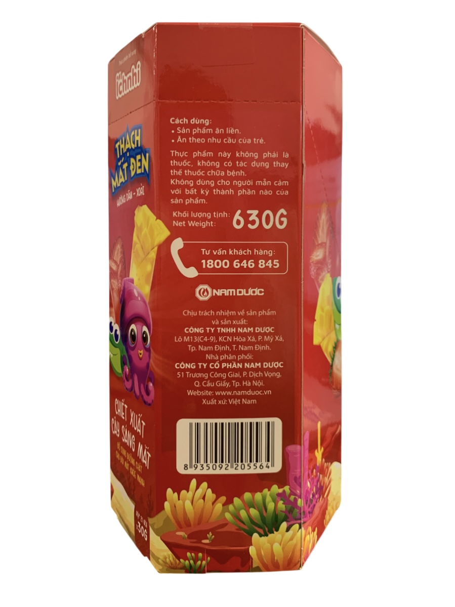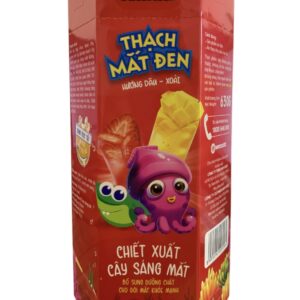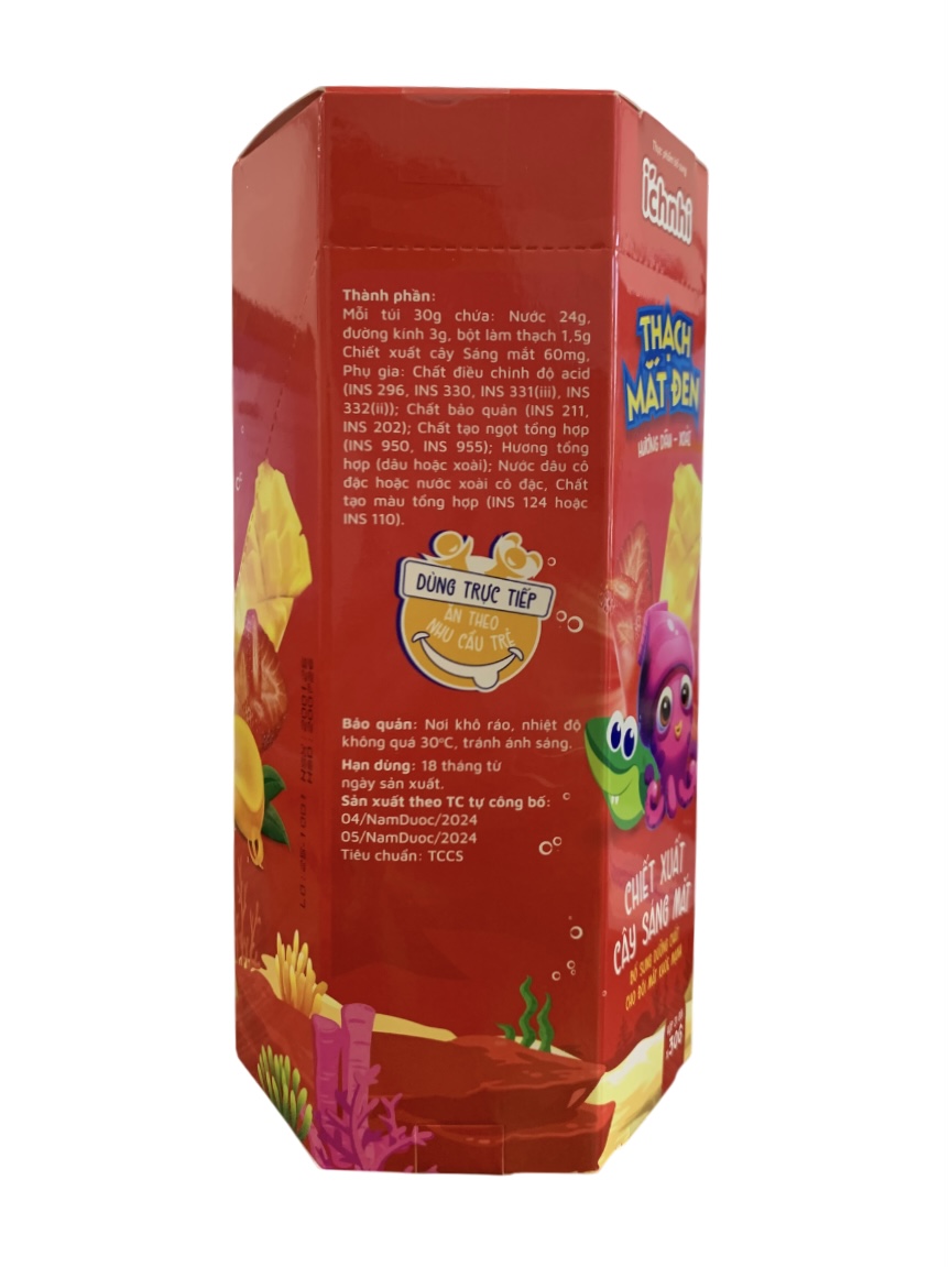 Chiết xuất cây Sáng mắt hàm lượng 0,06g, Nước, Bột làm thạch. Ngoài ra còn chứa các thành phần khác (đường, INS 296, INS 330, INS 331 (iii), INS 332 (iii), INS 211, INS 202, INS 950, INS951, Hương tổng hợp (dâu, xoài, khoai môn), màu alurared, màu ponceur 4R, màu sunset yellow, màu brilliant blue) vừa đủ 1 gói.